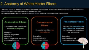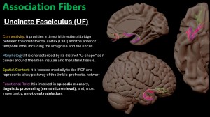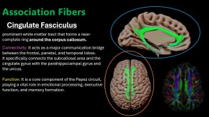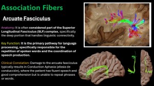 Arcuate Fasciculus: Historically the most famous tract. It connects the Broca’s area (motor speech) with Wernicke’s area (understanding).
