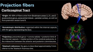 Corticospinal Tract (CST): The most critical motor pathway. It descends from the motor cortex through the posterior limb of the internal capsule. In neurosurgery, mapping the CST is vital to prevent post-operative hemiparesis.