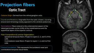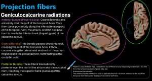 Optic Radiations (Geniculocalcarine Tract): Carries visual information to the occipital lobe. It includes Meyer’s Loop, which travels far forward into the temporal lobe. Radiologists must highlight this tract during temporal lobe epilepsy surgeries to avoid causing "pie in the sky" visual field deficits.