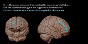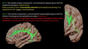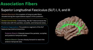 Superior Longitudinal Fasciculus (SLF): A massive bundle divided into three segments (SLF I, II, and III). It is the backbone of the "Where" visual pathway and visuospatial attention.