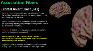 Frontal Aslant Tract (FAT): A more recently mapped tract connecting the Supplementary Motor Area (SMA) to Broca’s area, crucial for speech initiation.