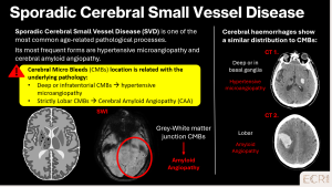 Cerebral amyloid angiopathy is caused by amyloid-β deposition within cortical and leptomeningeal vessels and is a major cause of lobar haemorrhage and CMBs in elderly patients. Its recognition is clinically relevant due to the increased risk of recurrent haemorrhage and implications for antithrombotic therapy. [1]