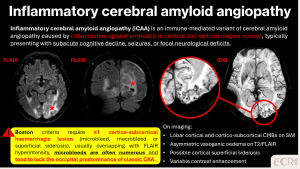 iCAA is an immune-mediated variant of CAA characterised by an inflammatory response against amyloid-β deposited in cortical and leptomeningeal vessels. It typically presents with subacute neurological deterioration, including cognitive decline, seizures or focal deficits, and is clinically relevant because it may respond to immunosuppressive treatment. [2]