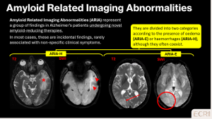 ARIA are treatment-related imaging findings observed in patients receiving anti-amyloid monoclonal antibodies for Alzheimer’s disease. ARIA is subdivided into ARIA-E (oedema) and ARIA-H (haemorrhagic changes), the latter including CMBs and superficial siderosis. [2]