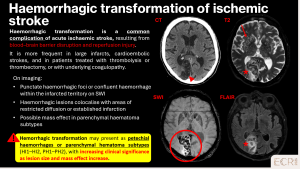 Haemorrhagic transformation occurs when reperfusion follows ischaemic injury, leading to microvascular leakage and petechial haemorrhages. [3]