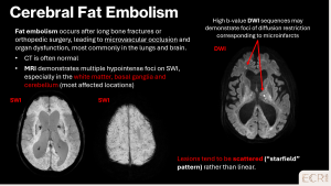 - Multiple punctate hypointense foci on SWI, often cortical and subcortical
