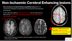 NICE lesions are rare post‑endovascular complications caused by microembolisation of catheter materials, leading to focal endothelial injury, microvascular inflammation, and petechial haemorrhages. [4]