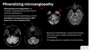 Mineralizing microangiopathy is an acquired, post-radiotherapy small-vessel complication. It typically presents with punctate microbleeds on SWI in previously irradiated regions, sometimes associated with subtle white matter changes. [1]