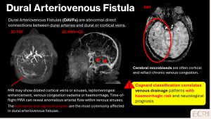 DAFVs are acquired connections between dural arteries and venous sinuses or cortical veins. They may present with headache, tinnitus, or focal deficits. Cortical or subcortical microbleeds on SWI indicate prior haemorrhage, often associated with cortical venous reflux. [5]