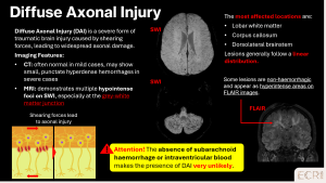 - DAI is characterised by microhemorrhages and non-haemorrhagic lesions along typical white matter tracts such as the splenium of the corpus callosum, brainstem and parasagittal regions, with prominent acute restricted diffusion.