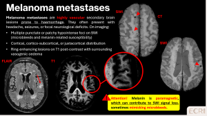 Haemorrhagic-prone metastases, such as those from renal cell carcinoma or melanoma, can cause CMBs. These are typically cortical or cortico-subcortical in distribution and may coexist with larger metastatic lesions or post-radiosurgery changes. Vasogenic oedema is usually minimal. [1]