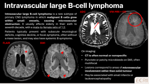 Intravascular large B-cell lymphoma is a rare subtype of primary CNS lymphoma characterised by malignant lymphocytes within small vessels, leading to microvascular obstruction and microbleeds. [8]