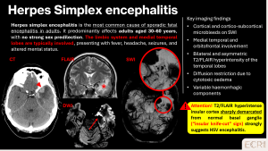 HSV encephalitis is a severe viral infection, classically affecting the medial temporal lobes and orbitofrontal regions. Clinical presentation includes fever, headache, seizures, and altered mental status. [9]