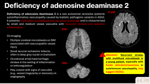 DADA2 is a rare autosomal recessive vasculopathy caused by ADA2 mutations. It typically affects children or young adults, presenting with recurrent strokes, systemic inflammation, and sometimes livedo reticularis/racemosa. Imaging may show multiple CMBs, small lacunar infarcts, and features of small / medium vessel vasculitis. [12]