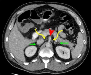 The celiac plexus is located in the retroperitoneum and consists of the right and left celiac ganglia along with the superior mesenteric ganglion. Each celiac ganglion lies on either side of the celiac trunk, medial to the adrenal glands, following their corresponding arterial vasculature. On CT, the ganglia exhibit a characteristic “discoid” or multilobulated appearance, best appreciated on axial images .