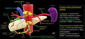 - In extrahepatic tumors, PNS typically occurs through the posterior hepatic plexus, a large tributary of the celiac plexus along the common hepatic artery as well as the posterior inferior pancreaticoduodenal artery and the superior mesenteric artery.