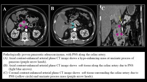 The tendency of pancreatic cancer to spread along nerves is likely attributable to the dense network of neural plexuses surrounding the pancreas. In pancreatic ductal adenocarcinoma, the most frequent sites of perineural spread are the celiac plexus and the plexus pancreaticus capitalis . Except for the celiac ganglia, the neural plexuses are not directly visualized at imaging, with the mesenteric arteries they follow serving as surrogate landmarks for detection, where PNS manifest as wispy increased attenuation or confluent perivascular soft tissue.