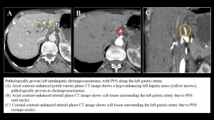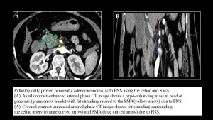 CT offers several advantages for detecting PNS, including superior spatial resolution, reduced sensitivity to motion, excellent fat–soft tissue contrast, and clear depiction of blood vessels that commonly run alongside nerves. In the upper abdomen, nerves are generally small and sparse to be directly visualized, making arterial branches reliable surrogates for neural pathways. Because recognition of PNS in this region relies on detecting subtle changes in the fat planes surrounding these vessels, CT outperforms MRI for evaluation of upper abdominal PNS.