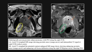 In prostatic cancer, perineural spread commonly involves the neurovascular bundle (NVB), which can be readily visualized on MRI and is considered a component of extraprostatic extension. Accurate detection of NVB involvement is critical for management, influencing decisions regarding surgery and the need for adjuvant therapies. On MRI, the NVB is located along the dorsolateral prostate and anterolateral rectum. Normally, it appears as low-signal-intensity foci within a triangular or round area of hyperintense fat at the prostate base and mid-gland on T1- and T2-weighted images. Involvement is suggested by asymmetrically enlarged nerves compared with the contralateral side, indicating tumor infiltration along the nerve sheaths.