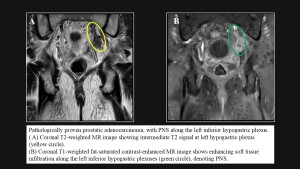 Radiologically, PNS can manifest either as abnormal soft-tissue attenuation extending along nerve routes(perivascular soft tissue) or as direct involvement of the tumor with the adjacent nerve roots or branches.