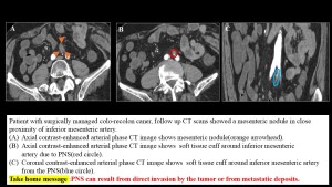 In rectal cancer, perineural spread carries a poorer prognosis .Tumor may track along the lumbosacral plexus, sciatic, obturator, and spinal nerves, frequently starting with the inferior hypogastric plexus. On imaging, PNS appears as nodular thickening and enhancement of the perirectal fascia extending toward the lumbosacral plexus. This plexopathy may result from direct tumor infiltration or metastatic deposits.