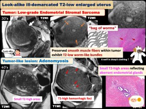 - May mimic adenomyosis, and characteristic myometrial invasion as “Bag of worms” (preserved T2-low smooth muscle bundles within T2-high tumor)