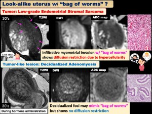- Multiple T2-high dilated, decidualized endometrial foci within adenomyosis is observed, which may mimic LG-ESS with “Bag of worms”