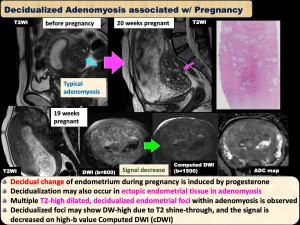 - Decidualization during pregnancy may also occur in ectopic endometrial tissue in adenomyosis