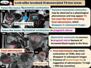 - Transient myometrial contraction may be observed as a physiological phenomenon and may appear T2-low mass-like lesion mimicking focal adenomyosis, which disappears in subsequent images. The appearance of lesions changes on kinematic MRI