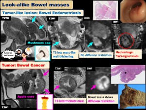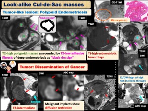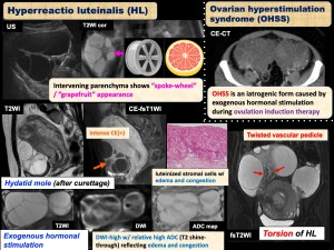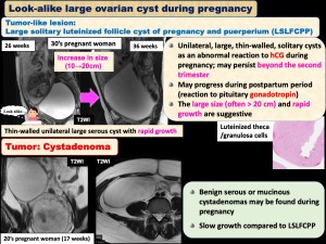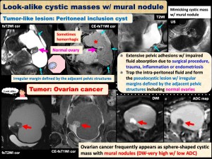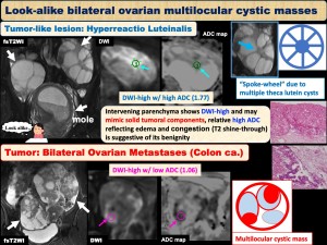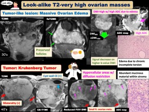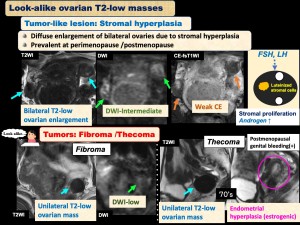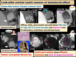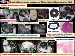 [Look-alike ovarian masses w/ T2-peripheral low /central high]