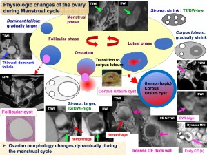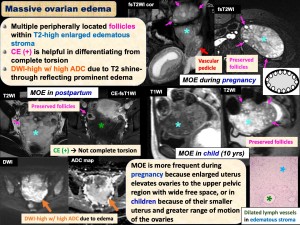 - Intermittent torsion causes partial obstruction of venous /lymphatic drainage, accumulation of edema fluid within the stroma, and ovarian enlargement, T2-prominent high, T2 shine-through (+)
