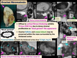 - Diffuse to cortical fibrous thickening exhibits T2-low due to dense stromal proliferation as “black garland”-like appearance. Ovarian follicles and corpus luteum may be preserved within the mass surrounded by the thickened cortex