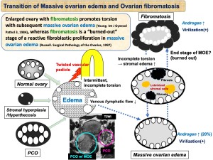 - There is an argument: enlarged ovary with fibromatosis promotes torsion with subsequent massive ovarian edema, whereas fibromatosis is a “burned-out” stage of a reactive fibroblastic proliferation in massive ovarian edema