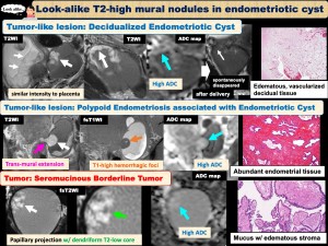 [Look-alike T2-high mural nodules in endometriotic cyst]