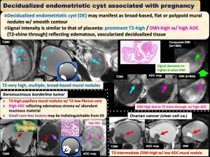 - Decidualized endometriotic cyst (DE) may manifest as broad-based, flat or polypoid mural nodules w/ smooth contour