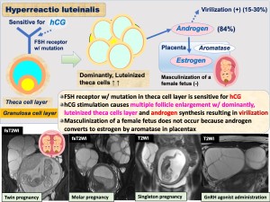 - Multiple theca lutein cysts caused by increased serum hCG, and hypersensitivity of FSH receptor w/ mutation