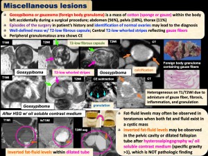 - Well-defined mass w/ T2-low fibrous capsule; Central T2-low whorled stripes reflecting gauze fibers
