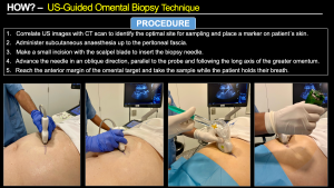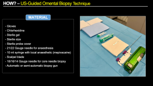 1. Prior to the procedure, a thorough review and correlation between abdominal US and CT images is recommended to identify anatomical landmarks that will help us choose the best percutaneous approach. In this regard, mass-forming sites with larger nodules or greater thickness and density of the “omental cake” on CT are preferable, as they provide a better sample than regions with ill-defined reticular infiltration of the omental fat.
