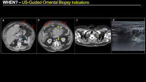 Omental biopsy in patients with suspected peritoneal carcinomatosis on CT and involvement of the greater omentum is a quick and safe method for achieving a definitive histological diagnosis, with reported diagnostic rates of around 95%.