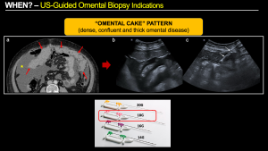 Ascites is not a major contraindication, but when it is abundant, drainage paracentesis is recommended prior to biopsy to reduce the distance to the omental disease and facilitate compression in case of post-biopsy bleeding.Fig 10: Peritoneal carcinomatosis with “omental cake” pattern in an 80-year-old woman with abdominal distension.