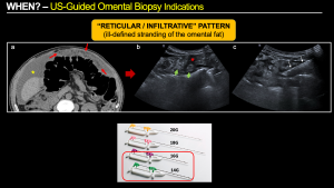 a) Reticular or infiltrative pattern. Characterised by a poorly defined reticulation and stranding of the omental fat. Although often perceived as a pattern with low diagnostic yield, several studies have demonstrated that a core needle biopsy in this context may have a diagnostic performance comparable to that of mass-forming sites.