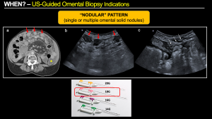 In the evaluation of peritoneal carcinomatosis, we can distinguish three patterns of omental involvement suitable for biopsy, which may coexist in the same patient: