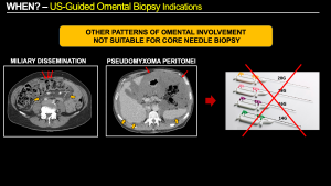 Other specific types of omental involvement include miliary dissemination (common in gastric cancer and unsuitable for core needle biopsy due to the tiny size of the implants) and pseudomyxoma peritonei (in which core needle biopsy is not recommended due to its low cellularity, abundant mucinous content that can dilute the sample, and the risk of needle tract seeding to the abdominal wall).