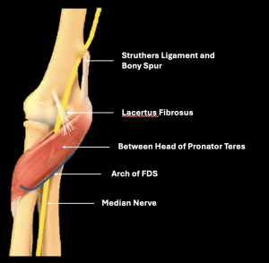 Sometimes anatomical variants can predispose the nerve to compression. One such variant is the Struther’s ligament, which connects the supracondylar spur to the medial epicondyle. Neurovascular bundles, including the median nerve, can be compressed along their course adjacent to the spur or the ligament. Even accessory muscles are known to cause median nerve entrapment in the forearm. One such example is the Gantzer muscle, an anomalous head of the FPL [1,3,5].