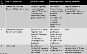 Clinical manifestations of median nerve pathologies depend on the site of involvement; however, they can overlap. The common pathologies and their manifestations are tabulated in [