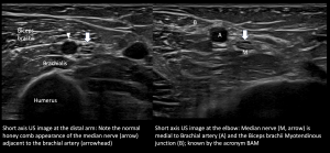 Although cut-offs for cross-sectional area at the carpal tunnel are well established, there is insufficient dedicated literature for these cut-offs at other sites. Comparison with the normal opposite site can be helpful when in doubt. The nerve fascicles are usually more prominent in the arm and become smaller distal to the elbow [5].