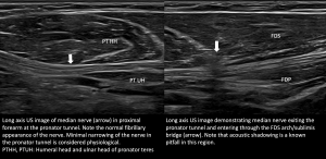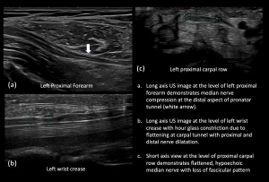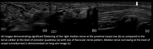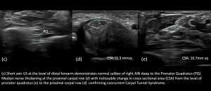 Dynamic assessment with stress manoeuvres like pronation- supination and flexion-extension, or using targeted probe pressure to elicit symptoms (Sonographic Tinel’s), can be further helpful in localising the site of involvement [6].