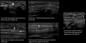 Nerve pathology can present with a variety of imaging appearances, depending on the degree and pattern of injury [7]. Common US findings in peripheral nerve pathology include nerve thickening, loss of fascicular appearance, perineural thickening, hyperemia, notch sign, hourglass constriction, and denervation of muscle groups, as demonstrated in