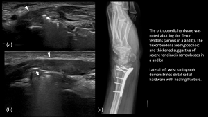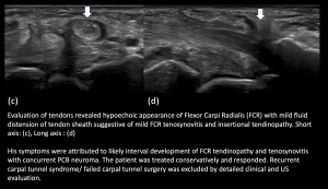Fig 16: POST CTR SURGERY PALMAR CUTANEOUS BRANCH (PCB) NEUROMA AND FCR TENOSYNOVITIS FCR tenosynovitis with tendinopathy - Post Open Reduction Internal Fixation (ORIF)/Carpal Tunnel Release (CTR), median nerve neuroma/thickening at the wrist crease proximal to the carpal tunnel