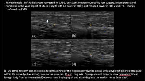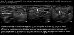 Fig 18: POST ORIF/CTR MEDIAN NERVE NEUROMA / THICKENING AT WRIST CREASE PROXIMAL TO THE CARPAL TUNNEL Post ORIF hardware abutment and flexor tendinosis - Post coronary artery bypass graft surgery (CABG), Median Nerve Neuropathy in Mid Forearm